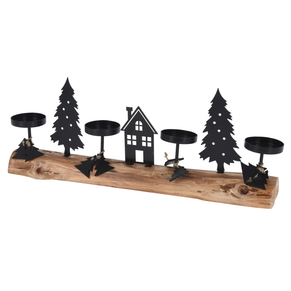4-es fém gyertyatartó fa talpon fém motívumokkal