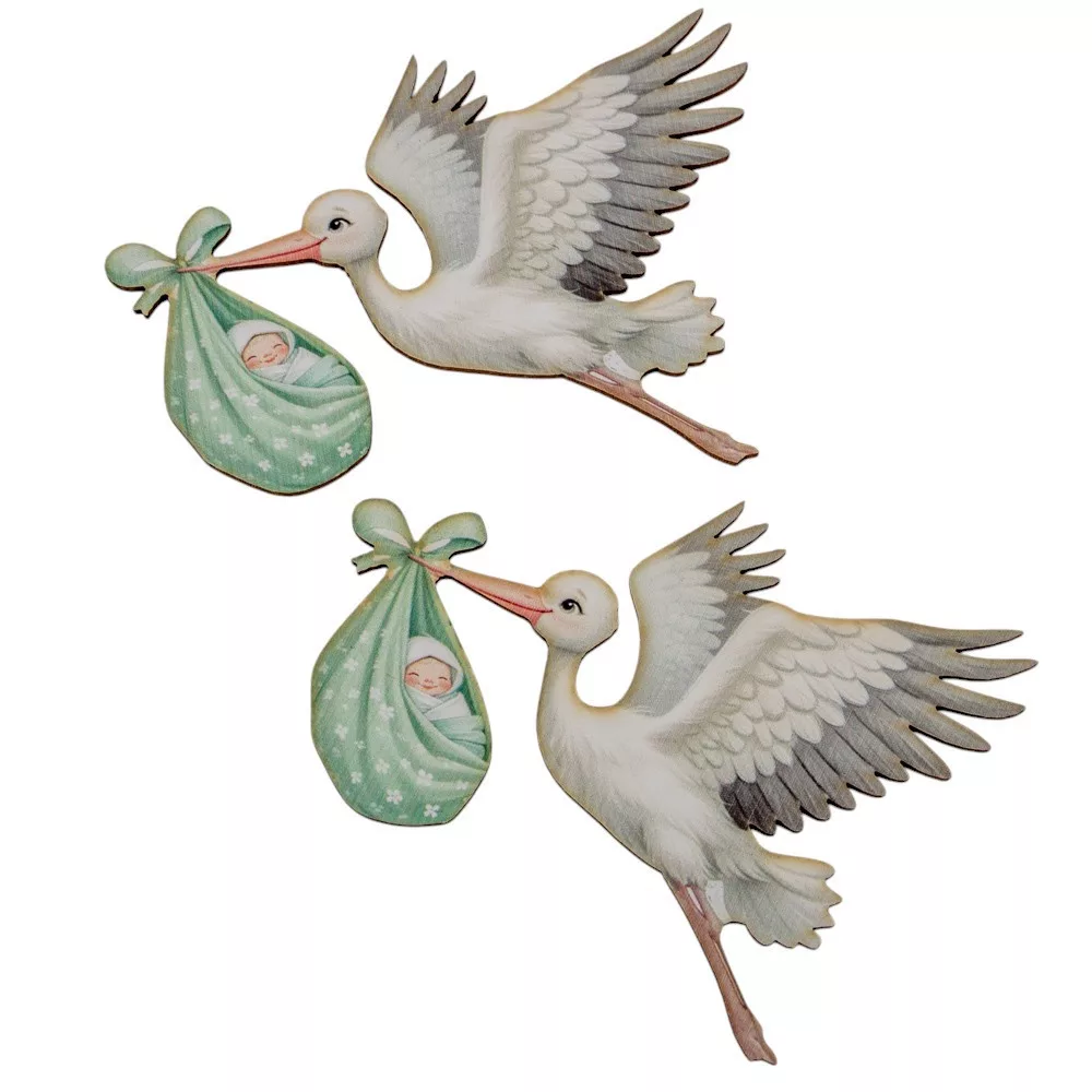 Nyomtatott dekorkarton gólya babával zöld 10cm 2db-os