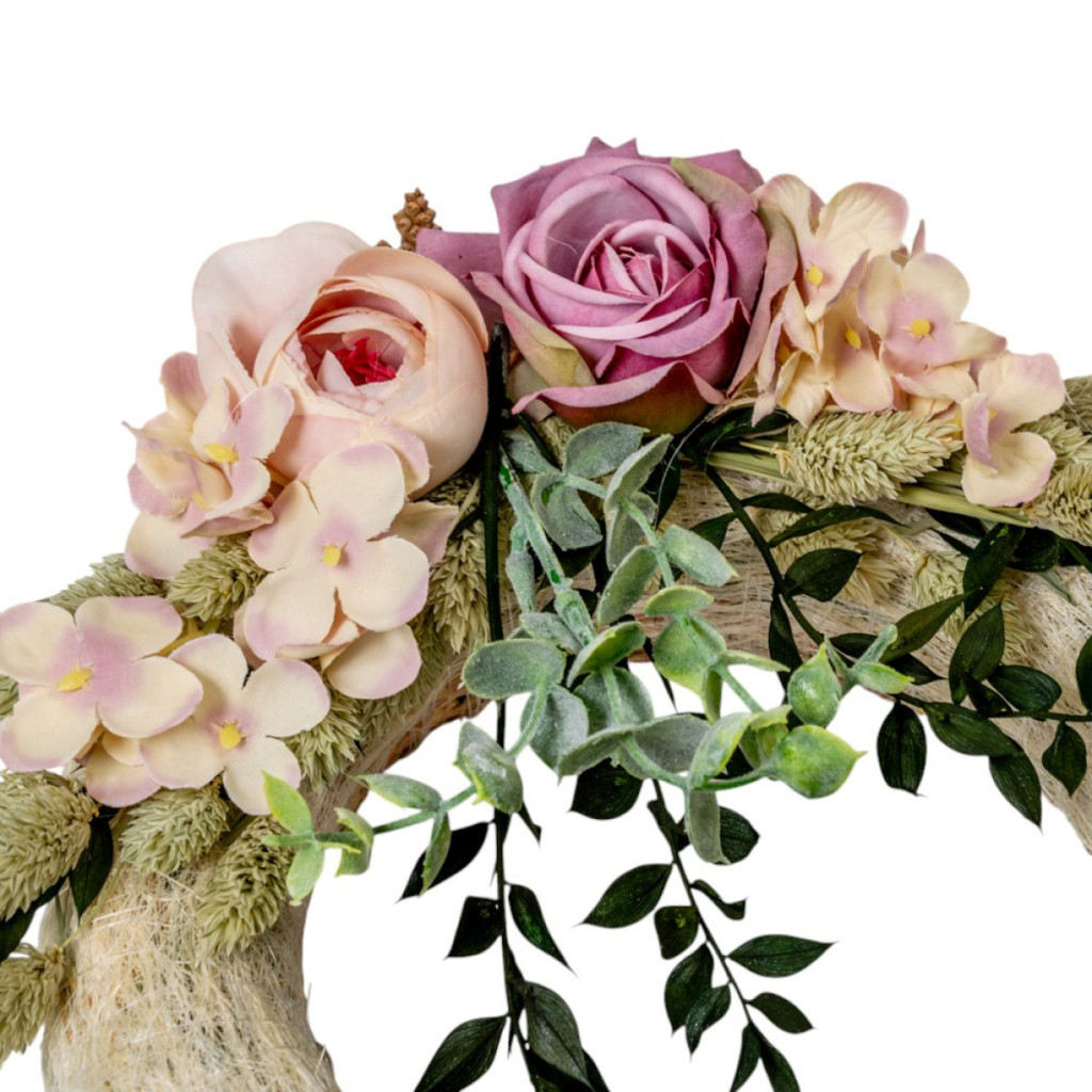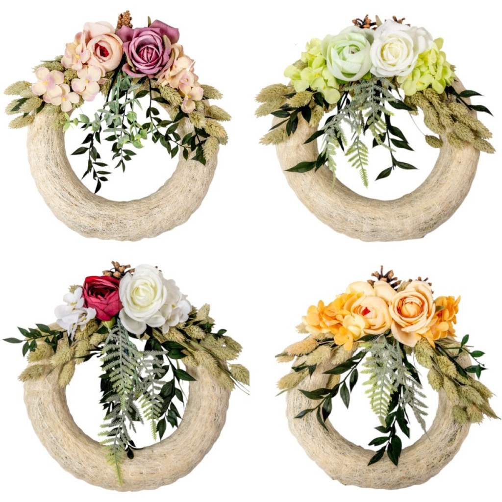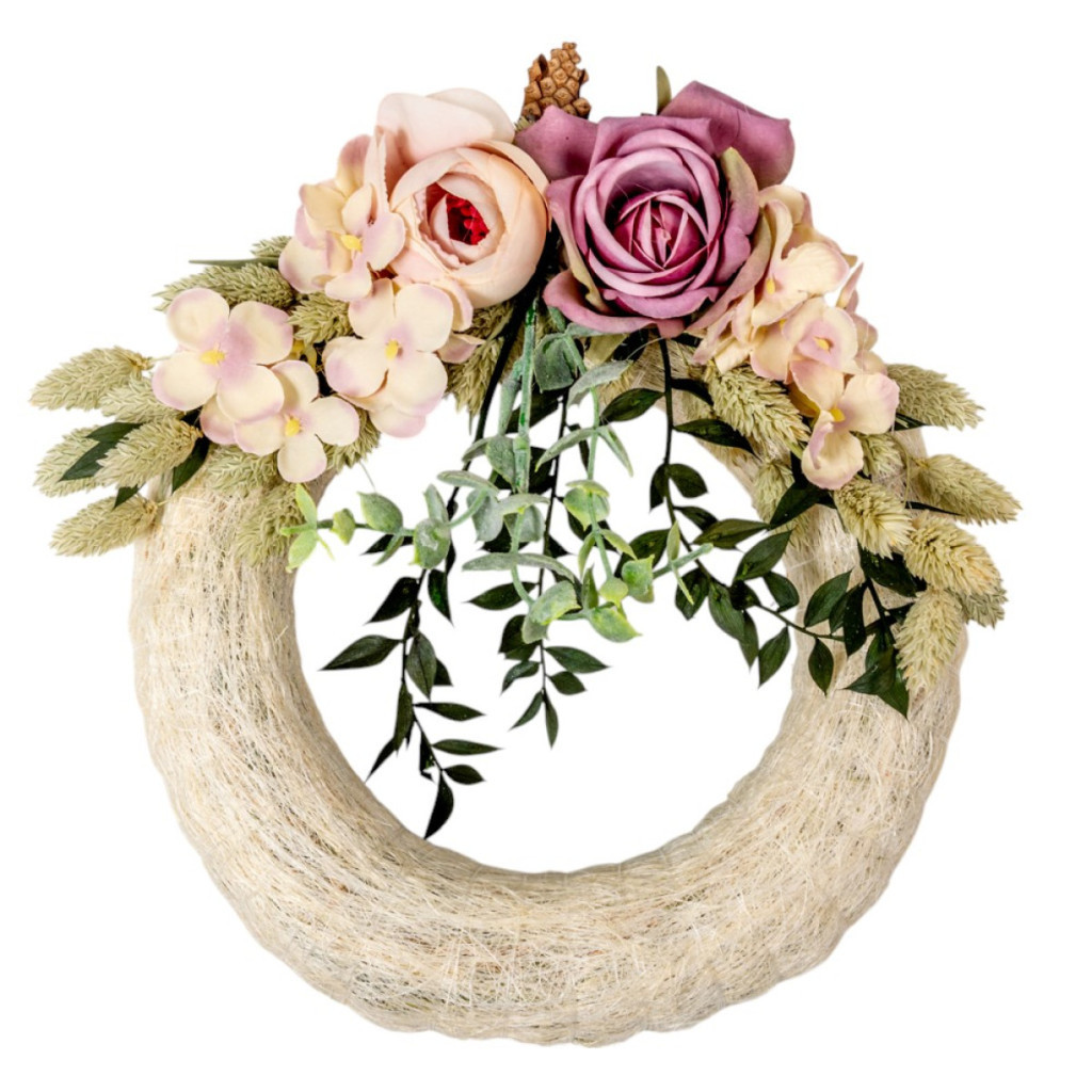 Szizálos szalma koszorú selyem és szárazvirág díszitéssel 22cm