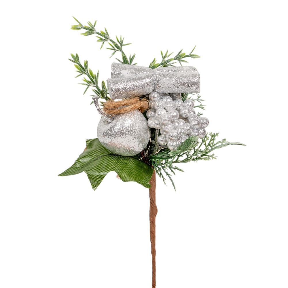 A 23 cm hosszú, ezüst almás és bogyós pick finom részleteivel a téli elegancia megtestesítője. A dísz ágai apró zöld levelekkel, ezüstös bogyókkal és csillogó almával egészülnek ki, melyeket vékony juta kötés és enyhén fagyos hatású bevonat tesz természetessé.