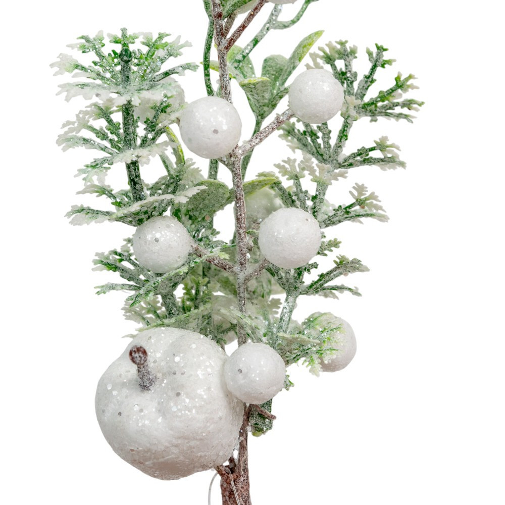 A dísz ágai csillogó zúzmarával bevont leveleket, bogyókat és egy apró almát tartalmaznak, melyek természetes, mégis ünnepi összhatást keltenek.