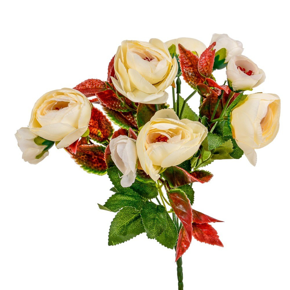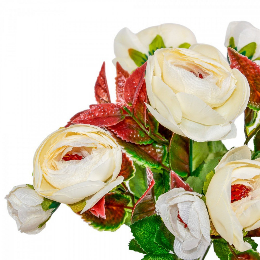 A 27 cm magas boglárka csokor kilenc virágfejet tartalmaz, különböző méretben és nyílási állapotban, hogy még élethűbb hatást keltsen. A virágok krém árnyalata elegánsan harmonizál a friss zöld levelekkel és a vöröses árnyalatú kiegészítőkkel.
