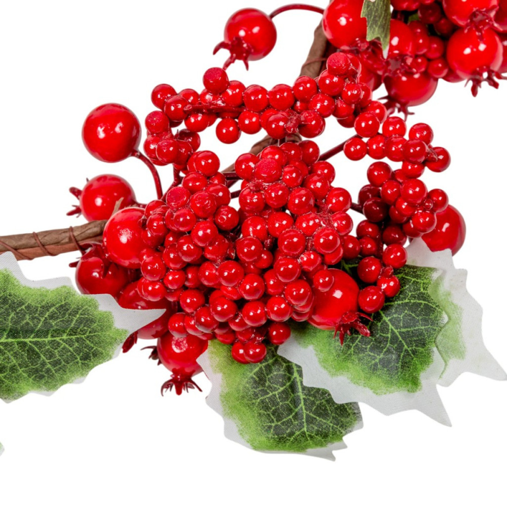A bogyós ajtódísz 36 cm a természet ihlette, mégis vidám karácsonyi hangulatot hozza el. A koszorú formájú dekoráció aprólékosan kidolgozott piros bogyókkal és élethű zöld levelekkel készült, melyek harmóniája elegáns, ugyanakkor meghitt összhatást kelt.