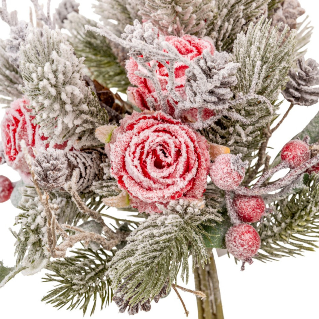 Ez a 35 cm-es rózsás köteg a tél varázslatos pillanatait idézi meg. A dérrel borított fenyőágak és a puha, rózsaszínes virágfejek friss, havas hatást keltenek. A kiegészítőként megjelenő bogyók és mini tobozok gazdag textúrát adnak a kompozíciónak. Tartós, élethű anyagból készült, így éveken át megőrzi szépségét. Tökéletes választás adventi koszorúkhoz, ajtódíszekhez, ünnepi asztali kompozíciókhoz vagy téli enteriőrök dekorálásához.