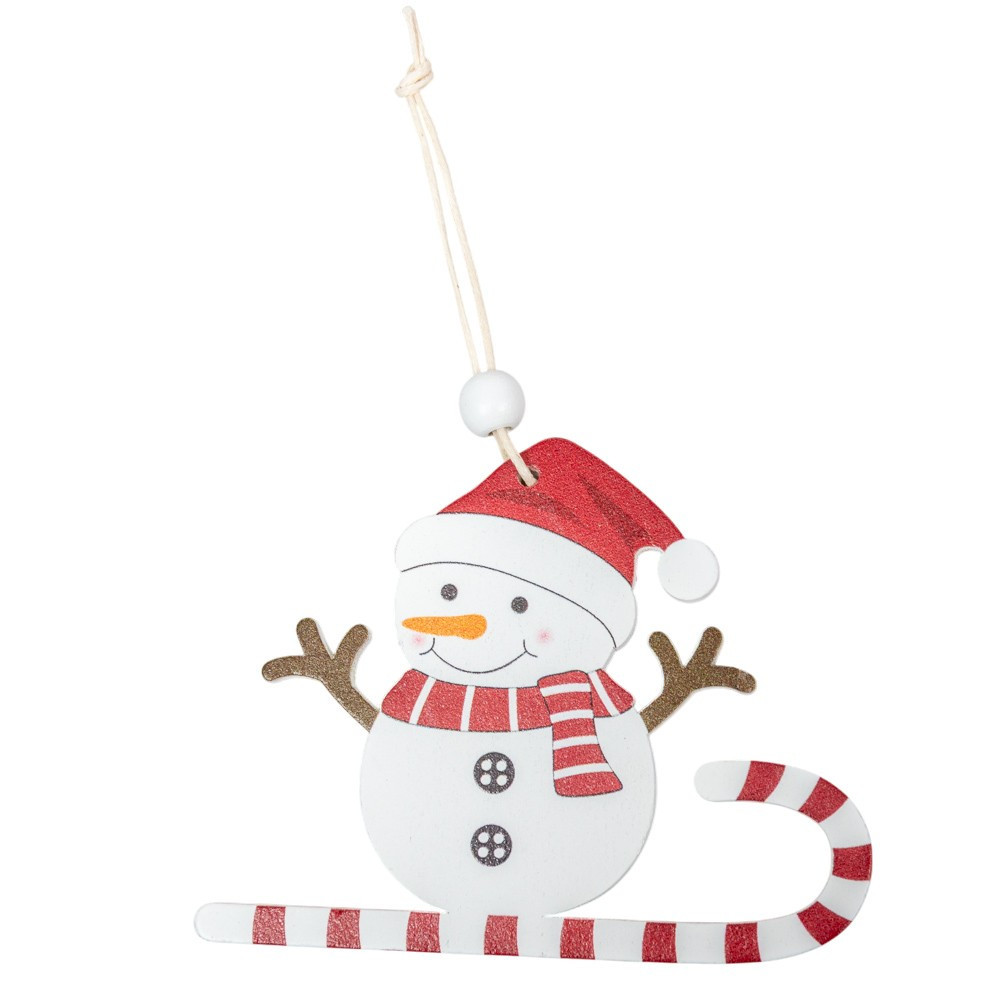 A piros-fehér cukorkabot formázó szánkó és a hóember mosolygós arca igazi karácsonyi hangulatot áraszt. Könnyű fa anyagának köszönhetően egyszerűen felakasztható karácsonyfára, ajtódíszre vagy ajándékcsomagra is.