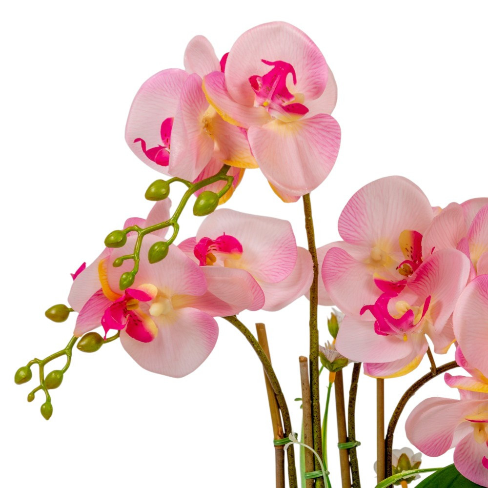 A legnagyobb értéke a prémium "real touch" alapanyagában és a dús, 4 ágú kivitelében rejlik, amely minden szögből esztétikus látványt nyújt. Az orchidea rózsaszín árnyalata fantasztikusan harmonizál a webáruházunkban kapható krémszínű kaspókkal, de remekül mutat a nálunk elérhető fehér fa tálcák központi díszeként is. Mivel tartós gumi anyagból készült, a szirmok nem fakulnak és könnyen tisztíthatóak, így hosszú évekig az enteriőr ékköve marad. Időtálló eleganciája miatt tökéletes választás olyan helyiségekbe is, ahol az élő növények nem maradnának meg.