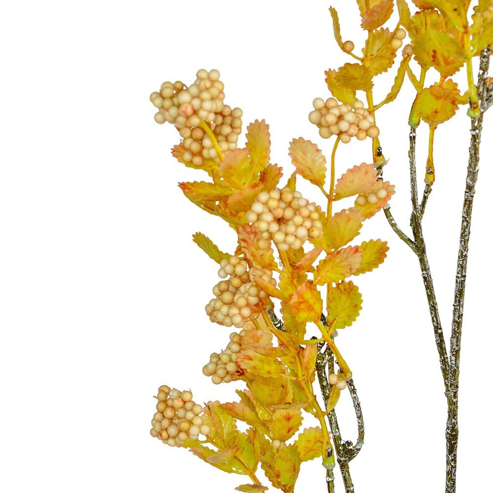 Az őszi bogyós ág barna 90 cm magas, több ágra osztott műdekor. A szár karcsú, mégis stabil, ezért könnyen beleállítod vázába, kaspóba, üvegbe. A kisebb oldalágakon sűrűn helyezkednek el az apró bogyók és a levelek, amelyek sárgás barna árnyalatban készülnek. Ez a színvilág jól illik tökökhöz, termésekhez, natúr fa tálcákhoz, gyertyatartókhoz. Használhatod önállóan egy egyszerű, letisztult őszi kompozícióhoz, vagy kombinálhatod más zöld és levélágakkal egy dúsabb csokorhoz. Koszorúalapra dróttal rögzítve szép bogyós koszorút készítesz ajtóra vagy asztalra. Pultokon, bejárati komódon, kávézók asztalán is jól működik, mert kevés helyet foglal, mégis látványos. Fotózáshoz és kirakati dekorhoz is praktikus, mivel a bogyók és levelek részletei közelről is szépen látszanak. Tartós anyaga miatt nem hervad el, minden ősszel újra felhasználhatod otthon és üzleti térben is.