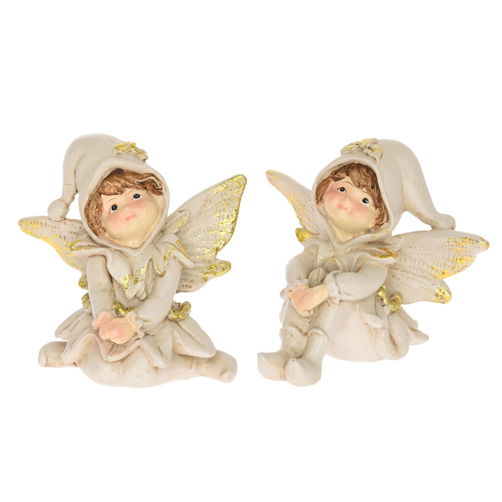 A tündér ülő polyresin dekoráció csodás választás, ha meghitt, finoman ünnepi hangulatot szeretnél teremteni. A figurák világos tónusú ruhát viselnek, szárnyaik arany színű festést kaptak, ami gyönyörűen kiemeli a részleteket. Mindkét változat kedves arcvonásokkal és játékos testtartással rendelkezik – az egyik lazán, előrenyújtott lábakkal ül, a másik oldalra fordulva, kissé felhúzott lábbal.